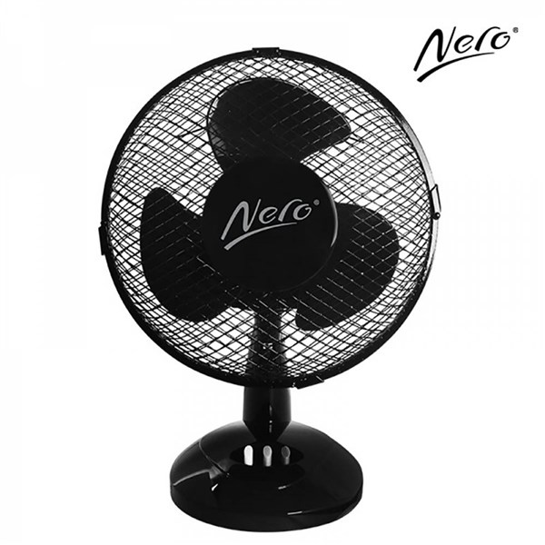 The Nero desk fan is wall powered | 2 speed settings | Oscillating | Metal safety fan guard | 3 plastic fan blades | Stable base