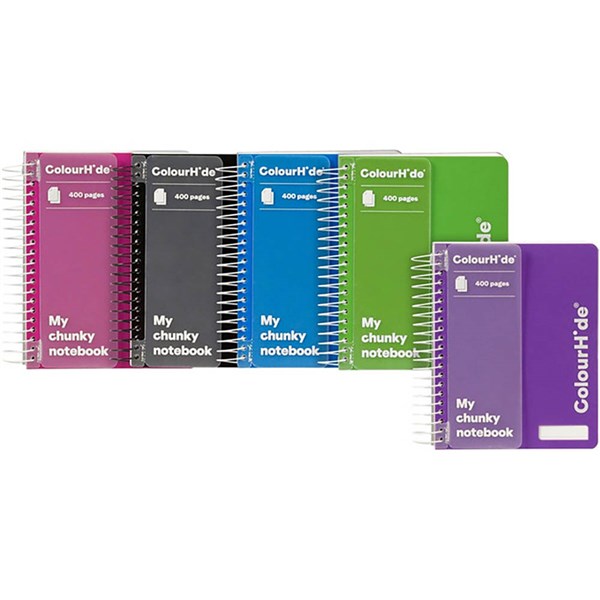 This ColourHide chunky notebook is the ideal companion to organise your ideas on the move | Contained in a robust polypropylene cover, this chunky notebook is perfect to write or draw in whenever you feel like it | This spiral bound notebook has 400 pages, giving you plenty of space to jot down your thoughts | It comes in a range of colours and will be randomly selected from available stock when purchased online | Colours will be chosen randomly