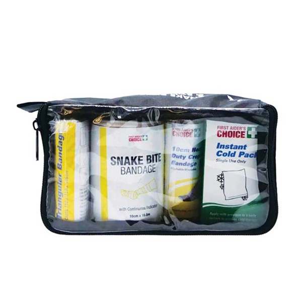 The First aiders choice snake bite and stings provides emergency treatment for snake bite and insect stings | Case comes with a belt loop on back so it's always accessible while outdoors | First aid treatment for everything from snake bites to insect stings | While effective antivenoms are available pressure immobilisation is recommended until medical aid can be administered | Our snake bite and stings module ensures you have the appropriate products available to administer immobilisation techniques in these emergencies | Ideal addition to outdoor work kits | Comes in belt looped case so it can be attached to pants, backpacks or first aid kits so it's always within reach | Kit Contents: 1 antiseptic cream 1g, 1 bandage crepe heavy support 10cm x 2m, 1 bandage snake bite indicator 10.5m stretched, 1 bandage triangular 110cm x 110cm x 155cm, 1 CPR chart, 1 instant cold pack, 1 snake bite treatment instruction card, and 1 spider bite treatment instruction card