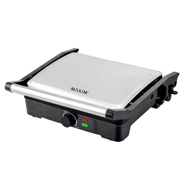 Stainless steel housing | Bakelite side handle with lock | Thermostat control | Ribbed non-stick cooking plates for easy cleaning | Power and ready indicator lights | 180 degree opening