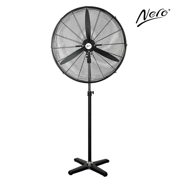 High velocity 75cm pedestal fan with cast aluminium blades, ideal for warehouse or commercial spaces | Assembly required, height adjustable | Keeping large commercial/industrial spaces cool in a pinch | Convenience of a plug and play pedestal | Features - 75 cm black pedestal fan - 3 x aluminium blades - 100% copper motor winding - Wall powered - 3 speed settings - Metal safety fan guard - Tiltable head - Oscillating - 1 year warranty - AUS/NZ Electrical Safety Standards Approved Product Specifications Brand: Nero Blade Speed: 1350RPM Airflow Rate: 280M3/MIN Sound: 78DB Colour: Black Power: 200 W Power Source: 240V A.C. mains Cable: 1.8m Dimensions: 1650 H x 630 W x 82 D mm Assembly required