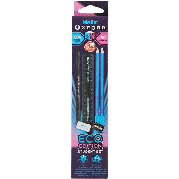 A trendy and eco friendly limited edition version of the traditional helix oxford student set | Oxford branded 6 piece stationery set with colour co-ordinated contents in a neon matrix cyberpunk design | Includes single hole pencil sharpener with anti tamper screw, black ballpoint pen with ergonomic grip and a 15cm ruler with metric graduations, all made from recycled plastic | Also includes PVC free eraser and 2x FSC certified HB graphite pencils with wood sourced from sustainable sources | Packed in plastic free packaging made from recycled card