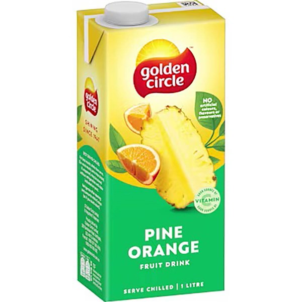 Golden Circle Pine Orange Fruit Drink is a refreshing blend of pineapple and orange flavors, perfect for quenching your thirst anytime | This 1L carton delivers a fruity, naturally delicious taste, ideal for family meals, lunchboxes, or everyday enjoyment | Convenient and ready to serve, it s a tasty way to enjoy your daily fruit flavors |This product is sold individually. For CTN quantities, please order in multiples of 12.